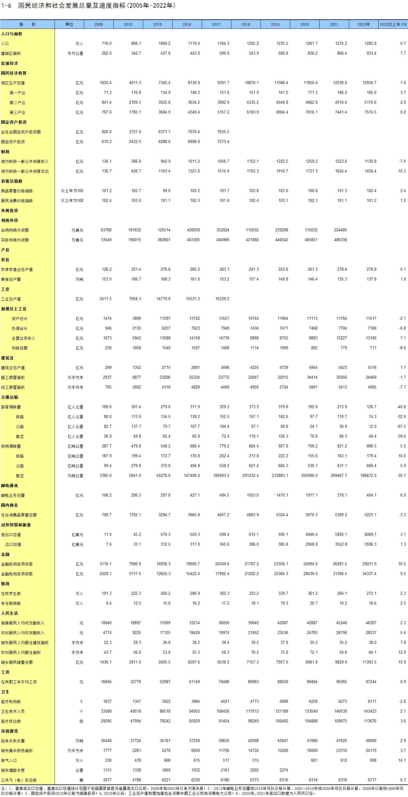 1-6 国民经济和社会发展总量及速度指标(2005年-2022年)