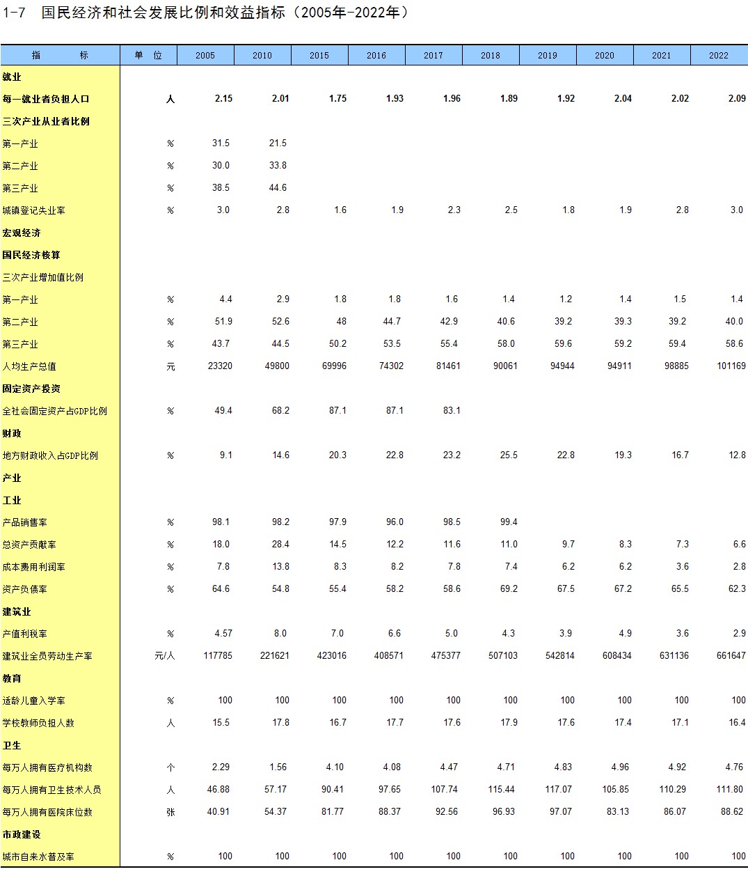 1-7 国民经济和社会发展比例和效益指标(2005年-2022年)