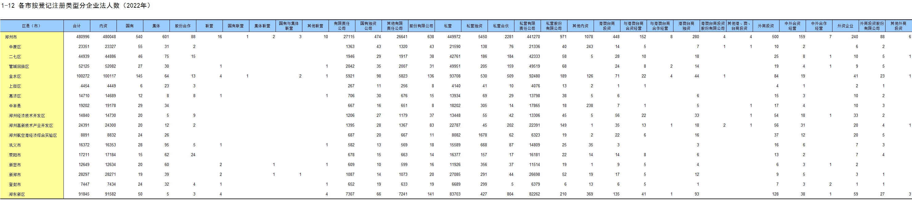 1-12 各市按登记注册类型分企业法人数(2022年)