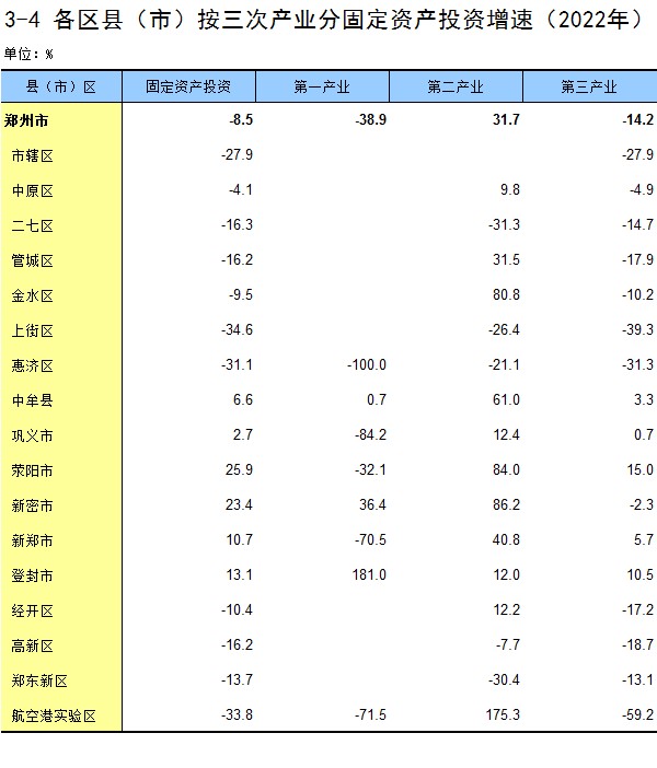 3-4 各区县(市)按三次产业分固定资产投资增速(2022年)