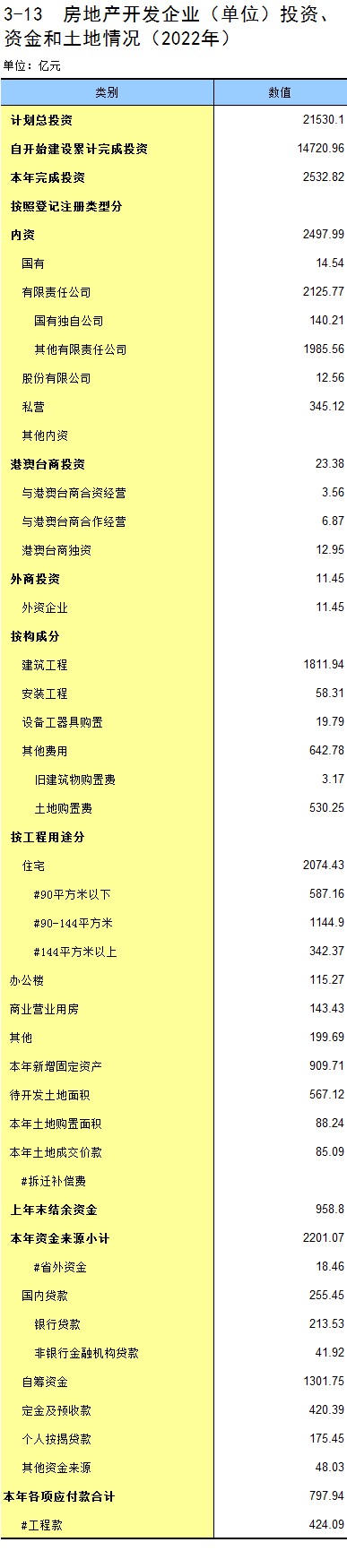 3-13 房地产开发企业(单位)投资、资金和土地情况(2022年)