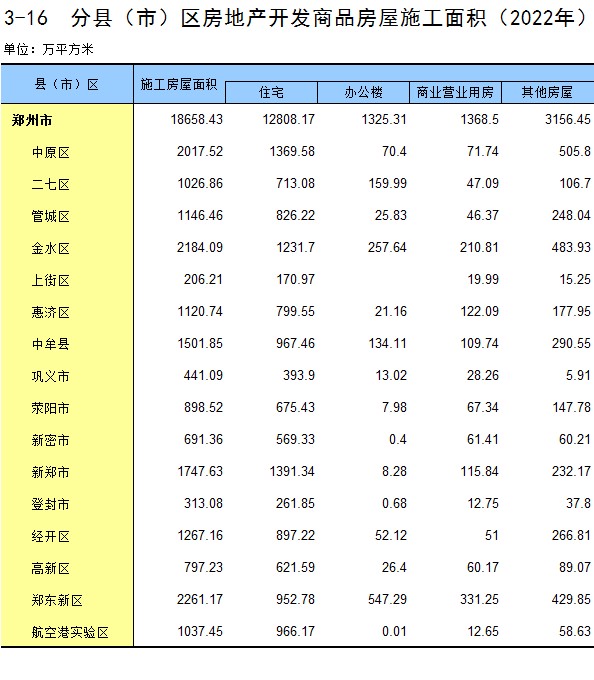 3-16 分县(市)区房地产开发商品房屋施工面积(2022年)
