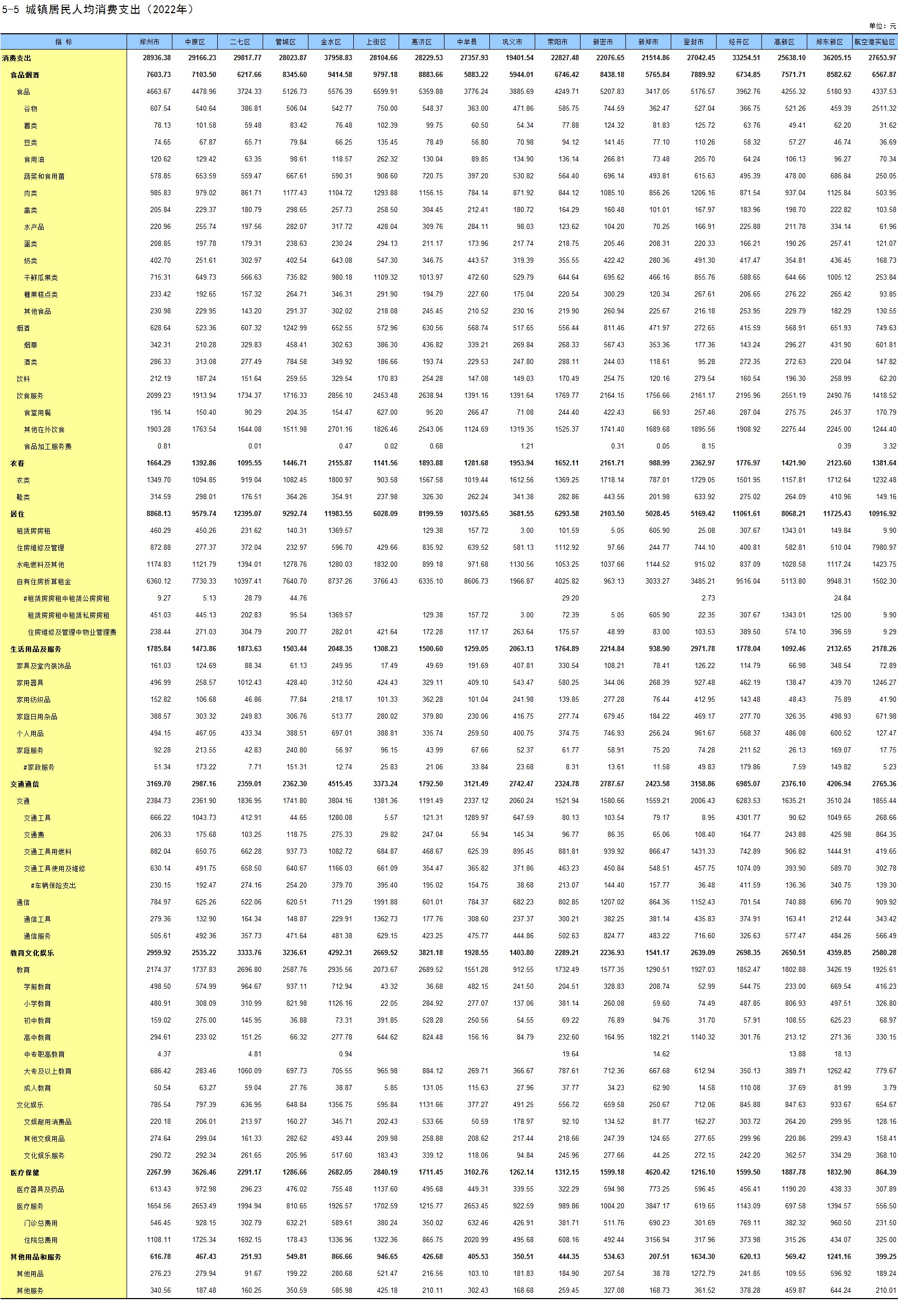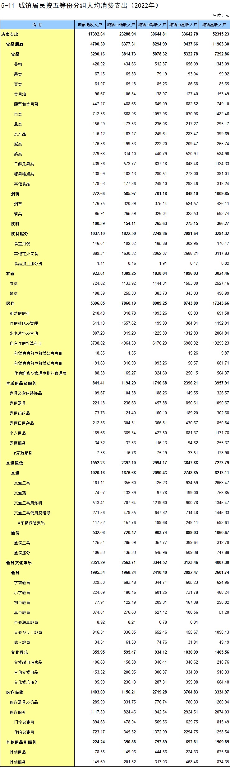 5-11 城镇居民按五等份分组人均消费支出(2022年)