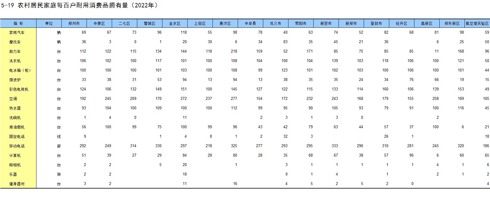 5-19 农村居民家庭每百户耐用消费品拥有量(2022年)