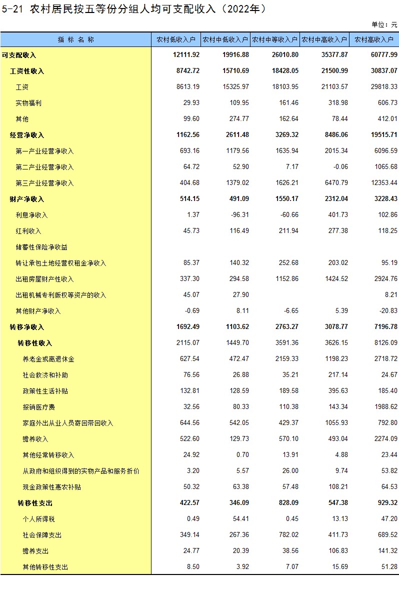 5-21 农村居民按五等份分组人均可支配收入(2022年)