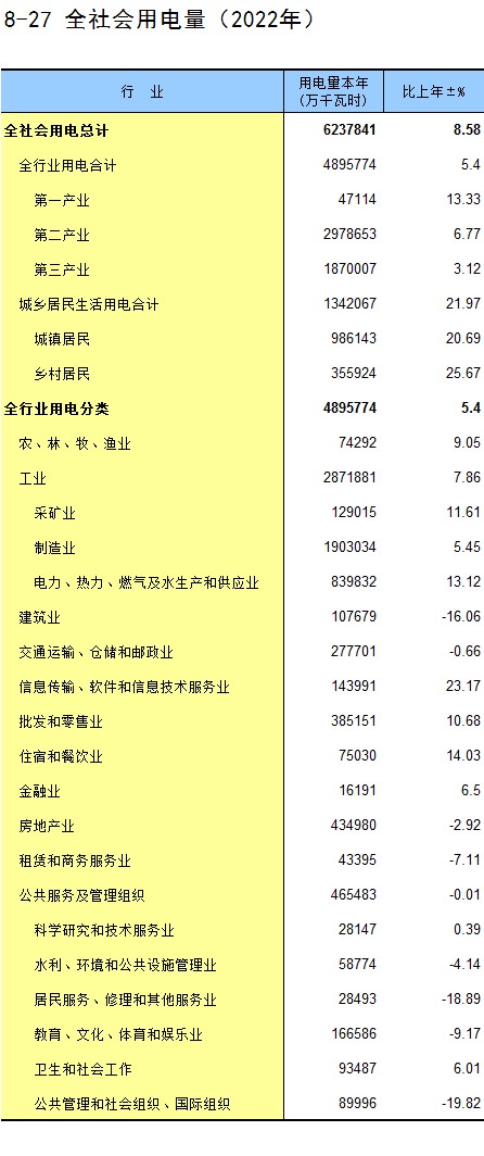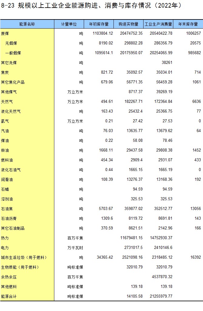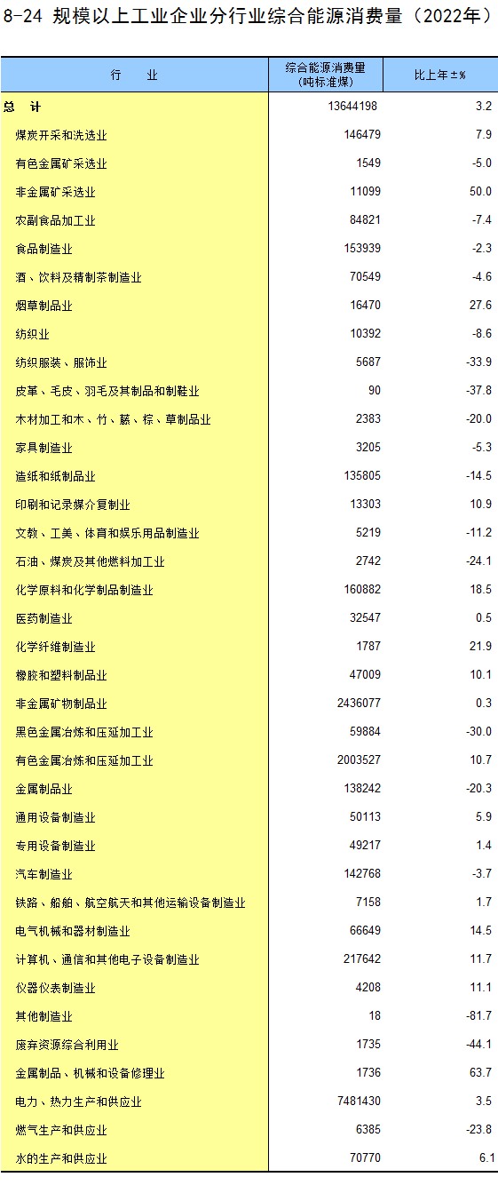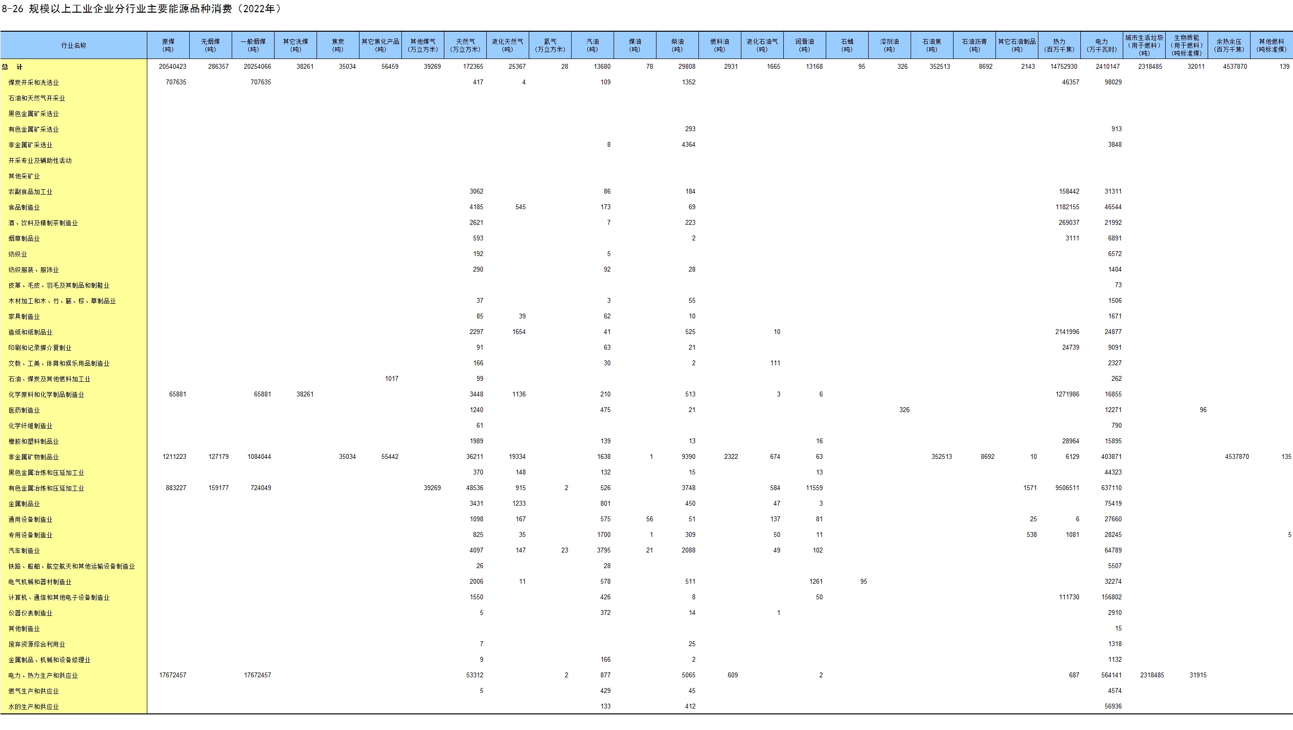 8-26 规模以上工业企业分行业主要能源品种消费(2022年)