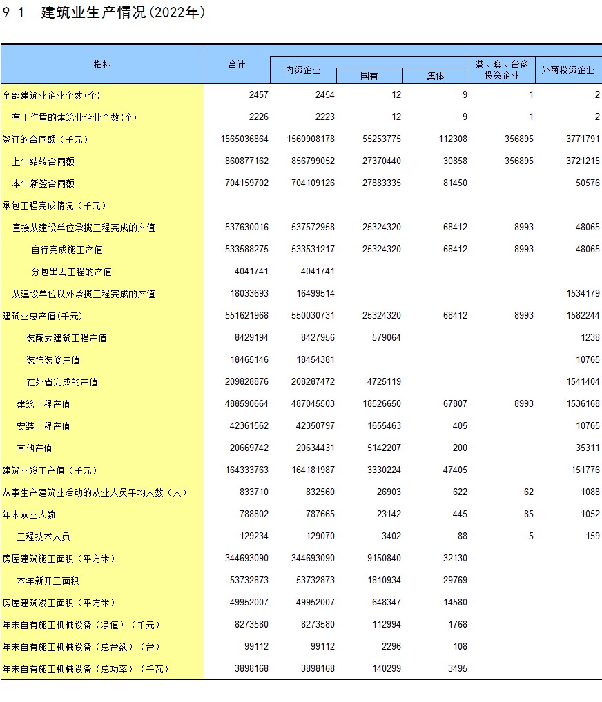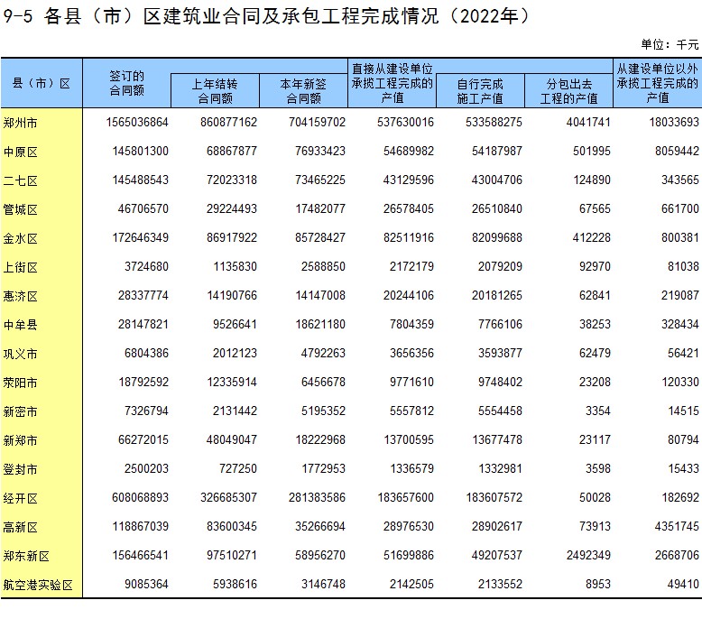 9-5 各县(市)区建筑业合同及承包工程完成情况(2022年)
