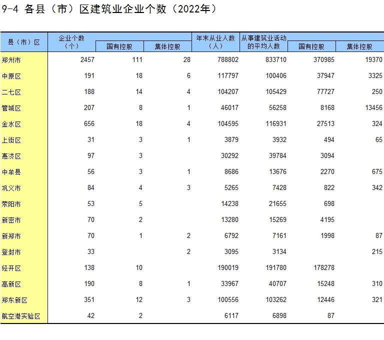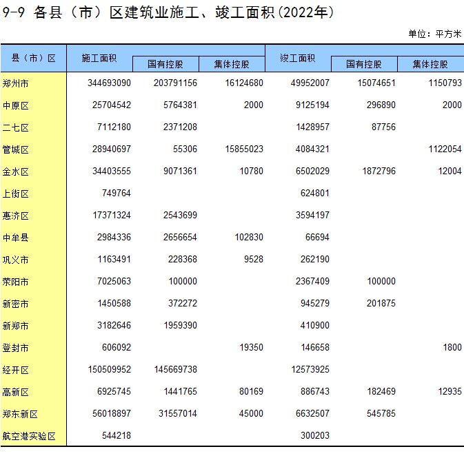 9-9 各县(市)区建筑业施工、竣工面积(2022年)