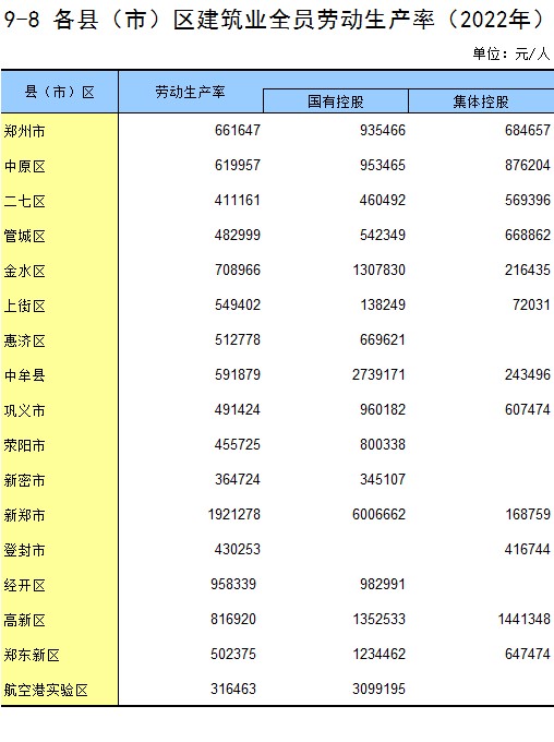9-8 各县(市)区建筑业全员劳动生产率(2022年)