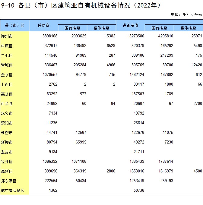 9-10 各县(市)区建筑业自有机械设备情况(2022年)