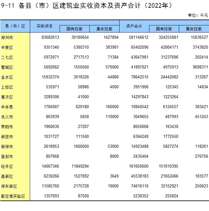 9-11 各县(市)区建筑业实收资本及资产合计(2022年)