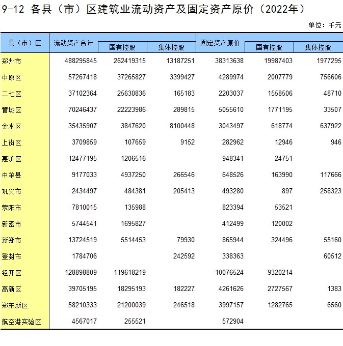 9-12 各县(市)区建筑业流动资产及固定资产原价(2022年)