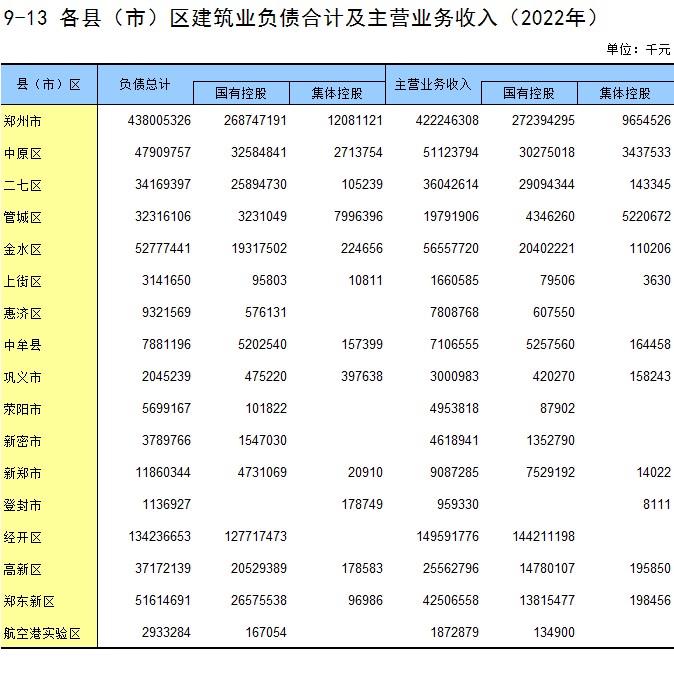 9-13 各县(市)区建筑业负债合计及主营业务收入(2022年)