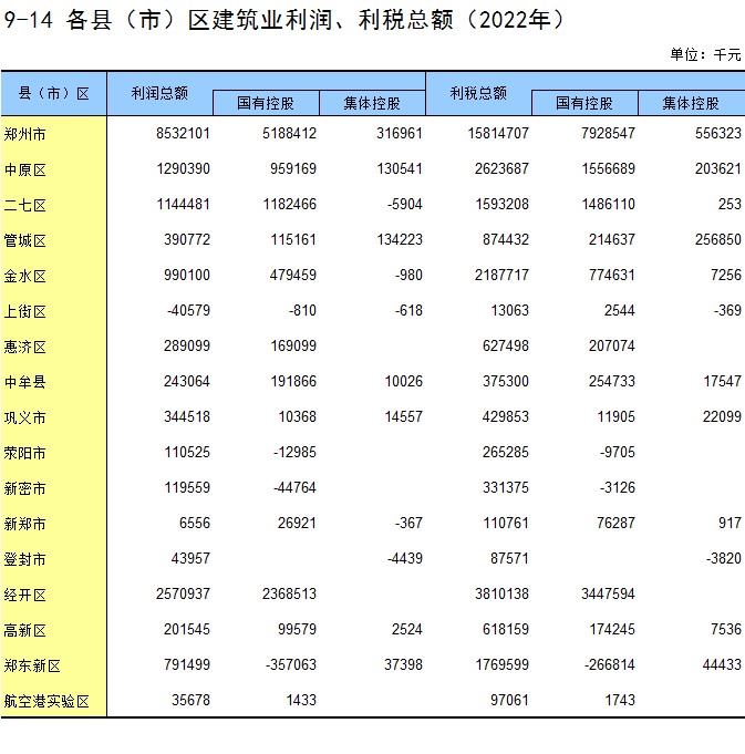 9-14 各县(市)区建筑业利润、利税总额(2022年)