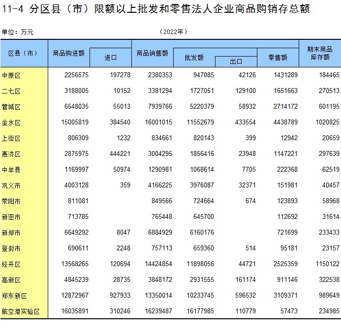 11-4 分区县(市)限额以上批发和零售法人企业商品购销存总额