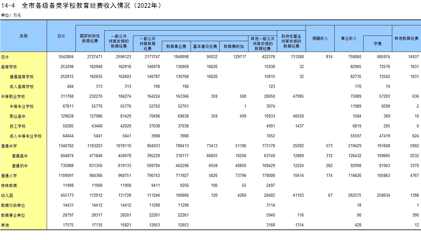 14-4 全市各级各类学校教育经费收入情况(2022年)
