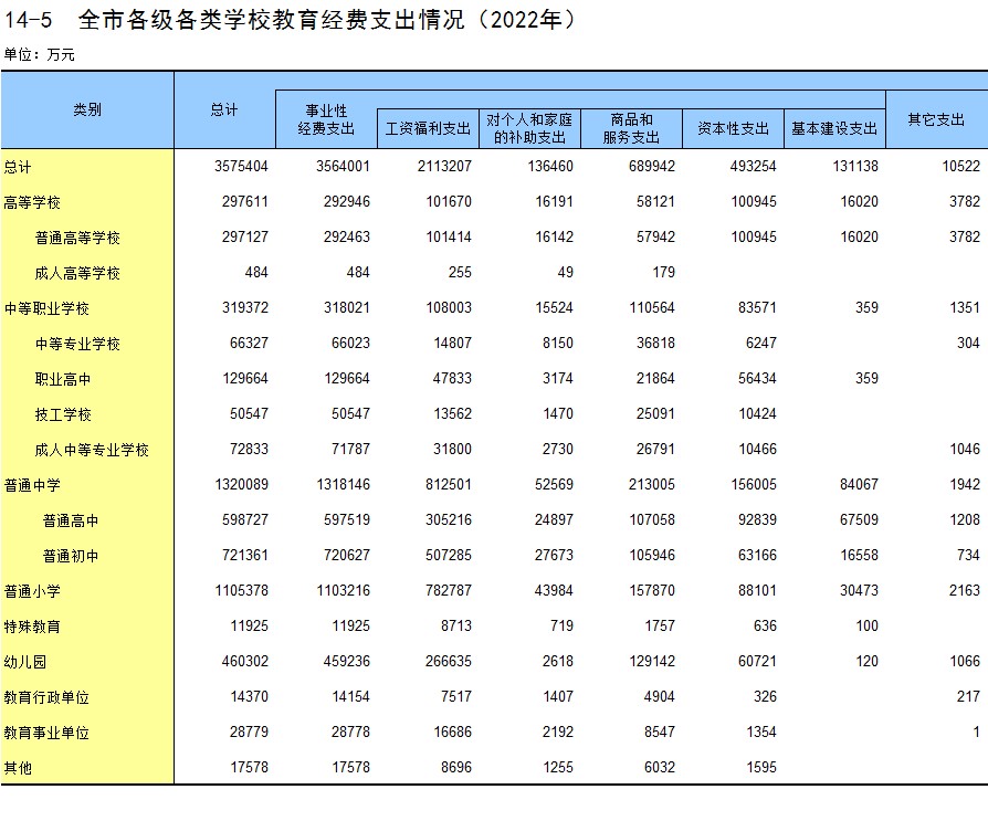 14-5 全市各级各类学校教育经费支出情况(2022年)