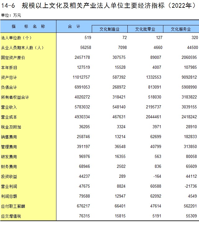 14-6 规模以上文化及相关产业法人单位主要经济指标(2022年)