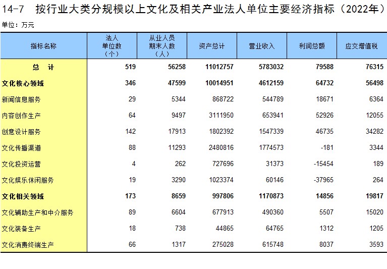 14-7 按行业大类分规模以上文化及相关产业法人单位主要经济指标(2022年)