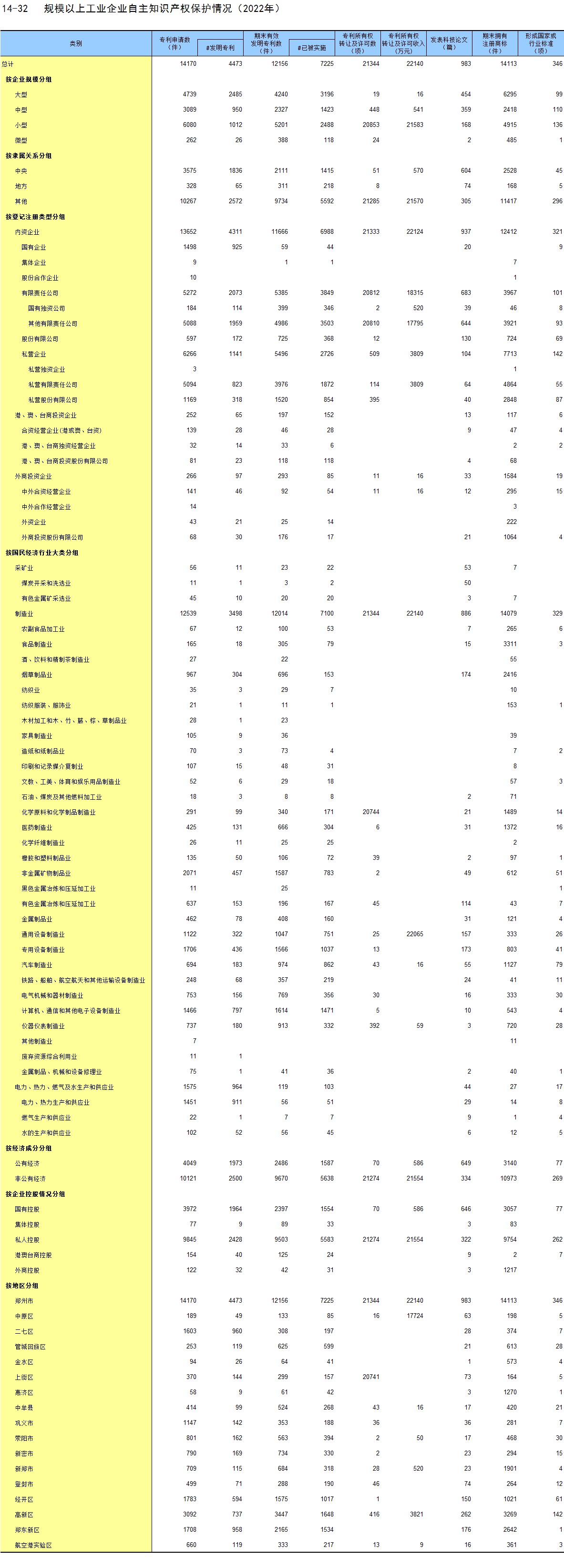 14-32 规模以上工业企业自主知识产权保护情况(2022年)