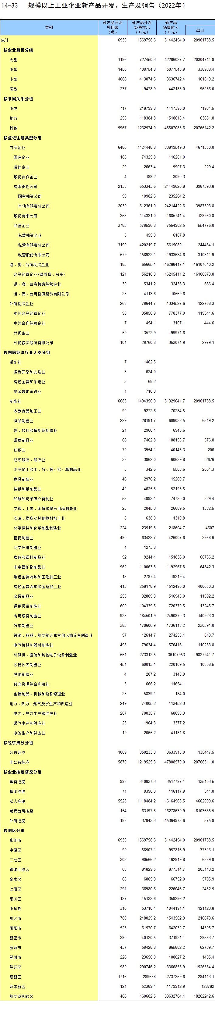 14-33 规模以上工业企业新产品开发、生产及销售(2022年)